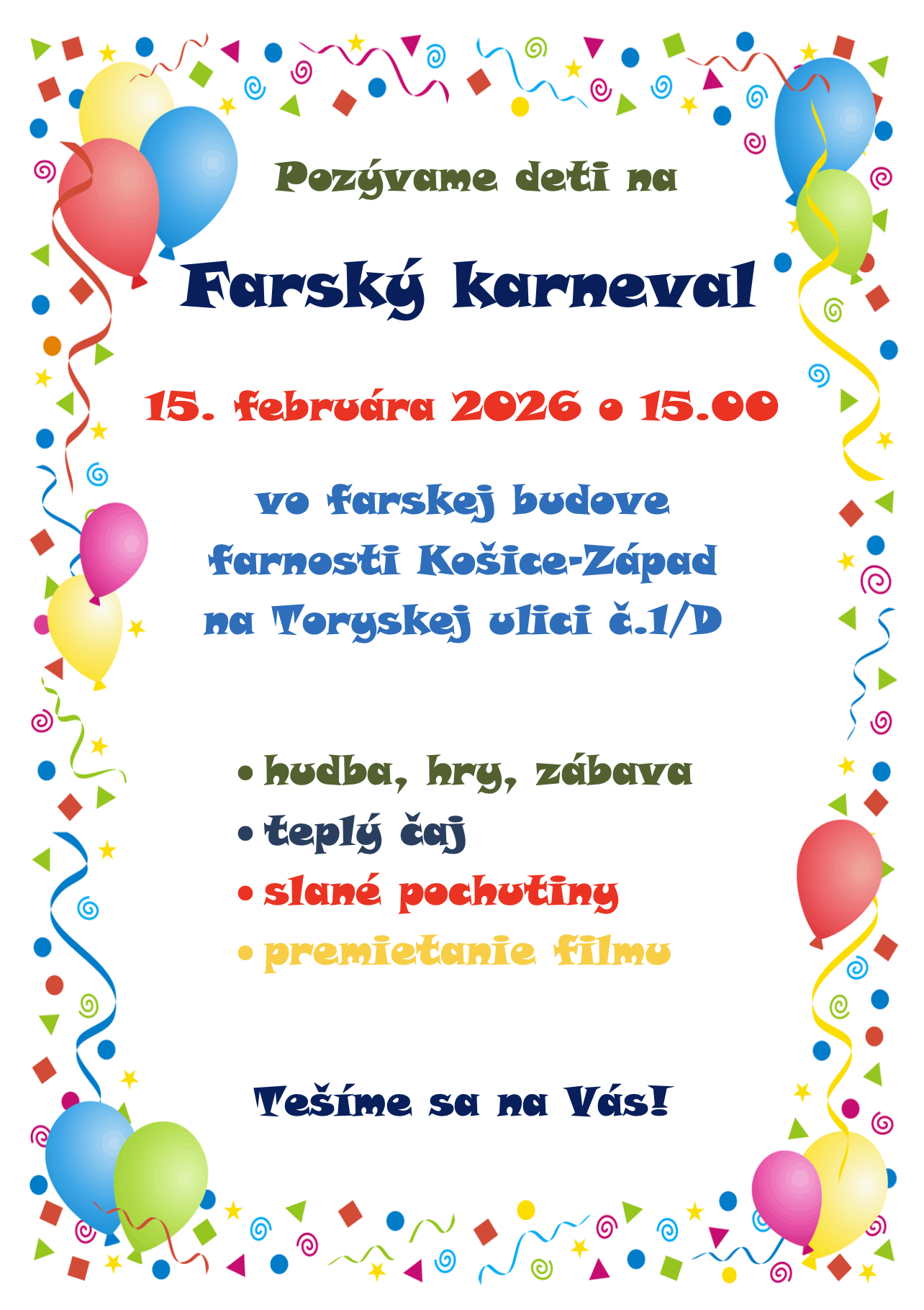 Pozývame deti na farský karneval, ktorý sa uskutoční 15.2.2025 poobede vo farskej budove pri chráme. Viac informácií v pozvánke nižšie. Tešíme sa na Vás!